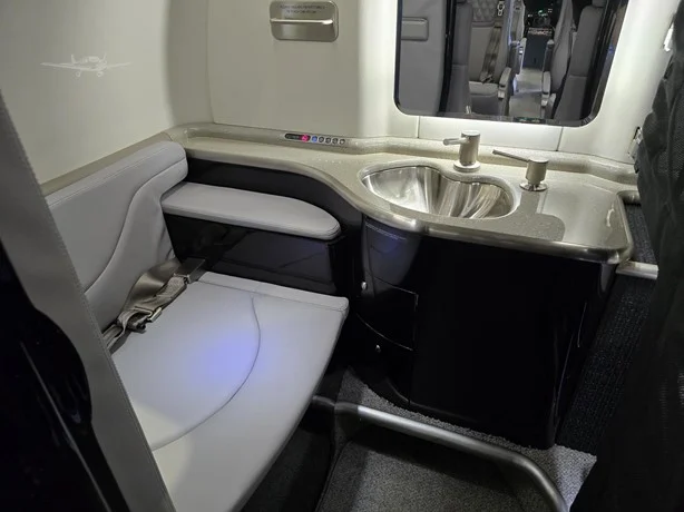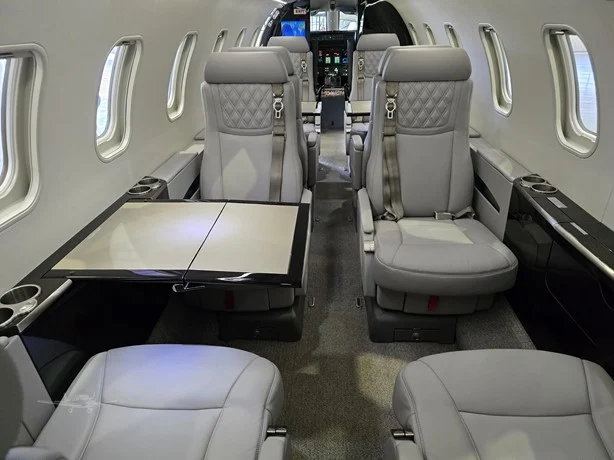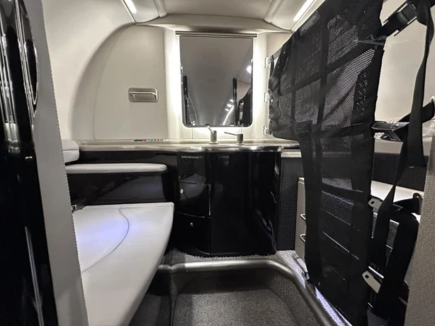 INTERIOR DETAILS Four (4) Executive Seats with Fold Out Tables Aft Cabin Configuration Four (4) Executive Seats with Fold Out Tables Lavatory Location(s) One (1) Aft Belted Carpet: Redrock Devon Row Wool Woodwork: High-Gloss Veneer and Laminate Quartered Figured Sycamore Leather Seats Lower Sidewall Raven Wing Upper Sidewalls and Headliner Arctic Last Interior Completion: 2024 GALLEY EQUIPMENT Cockpit to Cabin Divider Curtain Hot Liquid Container Ice Drawer Trash Storage Miscellaneous Storage Compartments