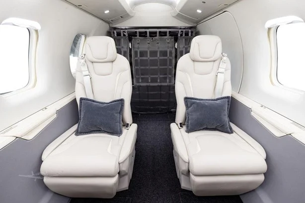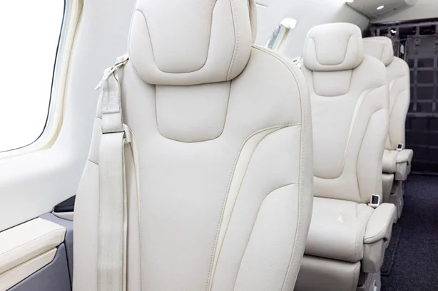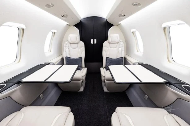 Interior Notes Passenger Seating: 6 + 2 Seat Executive Convertible Interior Configuration Configuration &Miscellaneous This interior is convertible between a 6-passenger and an 8-passenger executiveconfiguration. The present 8-passenger configuration consists of a forward 4-place club, followed by tworows of two forward-facing single seats. The alternate 6-passenger configuration provides for a forward 4-place club, followed by a single row of two forward-facing seats, allowing for a larger baggage area. The twoforward cabin forward-facing seats (Seats 3 & 4) feature the “Enhanced Executive Seats Upgrade”, whichincludes an outboard armrest, lumbar support, literature pocket, and 180 degree swivel on each seat. Thecockpit Copilot Seat may be occupied by a passenger at Pilot’s discretion. There is a cockpit curtain, forwardwardrobe, entryway lavatory, and an aft cabin convertible baggage compartment. A forward cabin bulkheadwith sliding doors provides privacy between the forward cabin and entryway/lavatory area. The lavatory alsohas a hinged privacy door that separates the cockpit and lavatory. The forward cabin features left and rightstorage cabinets with the righthand cabinet upper drawer dedicated to storing two carafes. CabinManagement The cabin features a “Welcome Screen” iPad, LED lighting, six (6) USB outlets, and four (4)115VAC outlets. There are two (2) USB outlets in the cockpit. Interior Finishes The interior features“Zebrano” satin veneer, “Silver, Pearlite” decorative hardware plating, and gray carpet. The cabin headlinerand window panels are covered in “Fusion Rice” synthetic leather, and the lower sidewalls are finished in“Marlin” leather with “Silver Dawn” leather table shrouds. The cabin seats are covered in “Marseille” leatherwith “Silver Dawn” leather seat backs/shrouds and “Edelweiss” leather accent stripes. The pullout tablesfeature “Edelweiss” leather inserts. New carpet was installed in March 2022. Lavatory: Forward The forwardlavatory is equipped with a stowable vacuum-flushing externally serviced toilet and a sink and faucet.Baggage Compartment An in-flight accessible baggage compartment is located in the aftmost section of themain cabin. The baggage area can be converted between a small and large baggage area depending onwhat interior configuration is installed. The baggage compartment features a large hinged upward openingcargo compartment door with pneumatic opening and electric-assist closing.