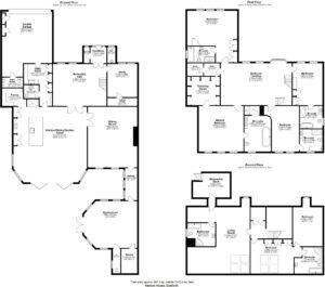 Stunning principal sitting room which doubles up as a cinema room with its media wall and state of the art plasma screen TV which is surrounded by built-in surround sound speakers | Gymnasium with sauna and bay window leading to terrace and decking | First floor galleried landing | Master bedroom suite with hand-made furniture, media wall, well equipped dressing room and stunning en-suite bathroom with double Jacuzzi spa bath and double wet room shower | Three further double bedroom suites, all with en-suite bathrooms with baths and showers; the fourth bedroom has its own mezzanine deck and study above | Second floor landing | Fifth bedroom suite with its own living room and en-suite bathroom/wc | Sixth bedroom with en-suite bathroom/wc